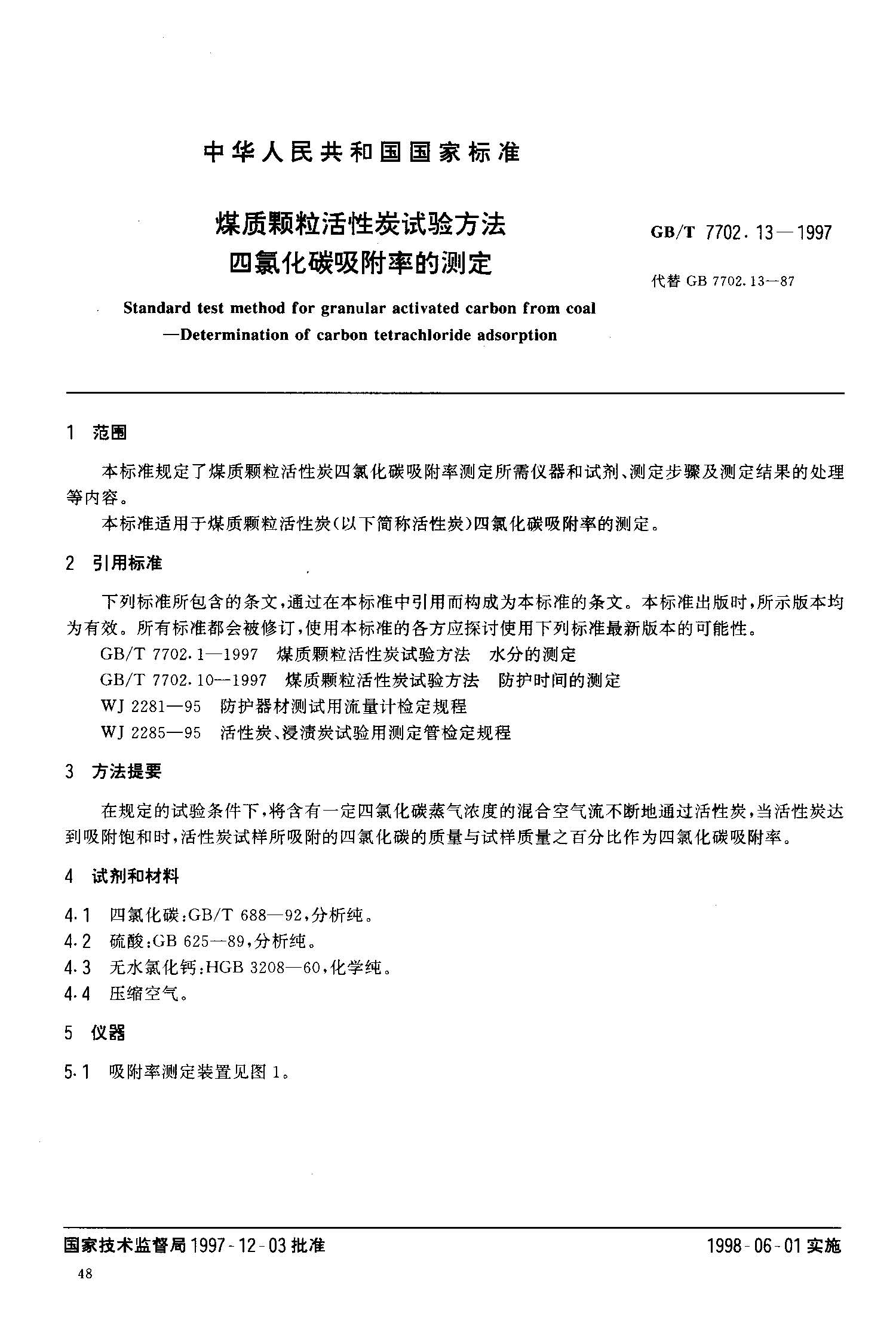 【GBT 7702.13-1997 煤質(zhì)顆粒活性炭試驗方法 四氯化碳吸附率的測定】
